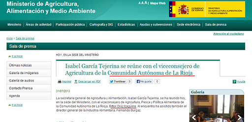El Partido Riojano ha revelado que el Ministerio de Agricultura dice haberse reunido con el Viceconsejero de Agricultura, Pesca y Política Alimentaria de la Comunidad Autónoma de La Rioja, Bittor Oroz Izaguirre el día 31 de Julio de 2013, tal y como consta el la nota oficial del Ministerio de Agricultura. Esto demuestra que Arias Cañete y su Secretaria General de Agricultura y Alimentación, Isabel García Tejerina, no saben ni donde esta La Rioja ni sus necesidades y la incluyen dentro del País Vasco en un error lamentable y muy significativo de los conocimientos de los responsables máximos del Ministerio.