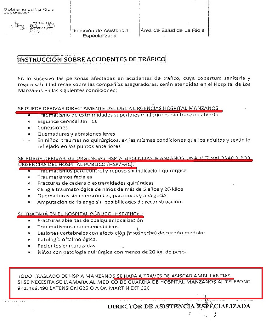 El presidente del Partido Riojano, Miguel González de Legarra, ha hecho público esta mañana el contenido de una “Instrucción sobre accidentes de tráfico” dictada por el Director de Asistencia Especializada del Área de Salud de La Rioja en la que se establecen las normas para la atención de las personas afectadas en accidentes de tráfico en nuestra Comunidad Autónoma y ordena que, “En lo sucesivo, las personas afectadas en accidentes de tráfico cuya cobertura sanitaria y responsabilidad recae sobre las compañías aseguradoras, serán atendidas en el Hospital Los Manzanos…”