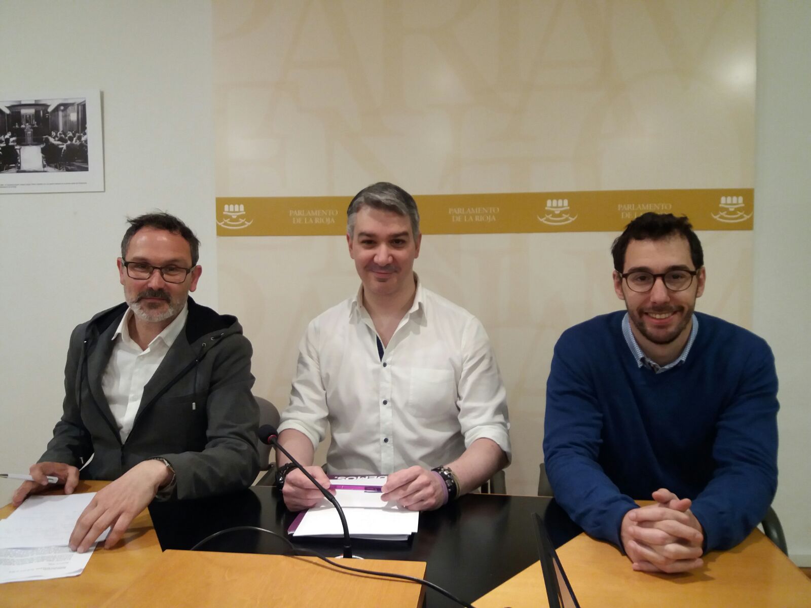 El Presidente del Partido Riojano, Rubén Antoñanzas, acompañado del Secretario de Acción Electoral de su partido, Víctor Grandes, ha mantenido hoy un encuentro en el Parlamento de La Rioja con el portavoz de del grupo parlamentario de Podemos, Germán Cantabrana, que invitó a los representantes del PR+ para informarles de primera mano de la situación en la que se encuentra la tramitación del Estatuto de Autonomía.