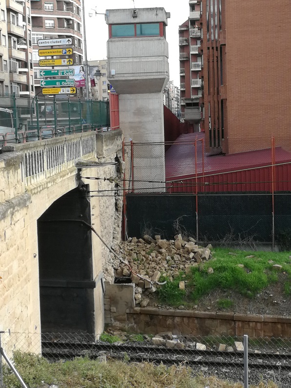 En concreto, según los datos del Concejal regionalista, el derrumbe se sitúa en el puente ubicado al final de la Calle Marqués de Murrieta, donde comienza Avenida de Burgos y bajo el que transcurre la vía férrea. “Como consecuencia de la copiosa lluvia, todo el recubrimiento de piedras de la parte exterior del muro del puente, en su parte mas próxima al acuartelamiento de la 10ª Zona de La Guardia Civil, se vino abajo, cayendo incluso parte de estas piedras de considerable tamaño, sobre el balasto de la vía, quedando muy próximas a los raíles”, explica Antoñanzas.